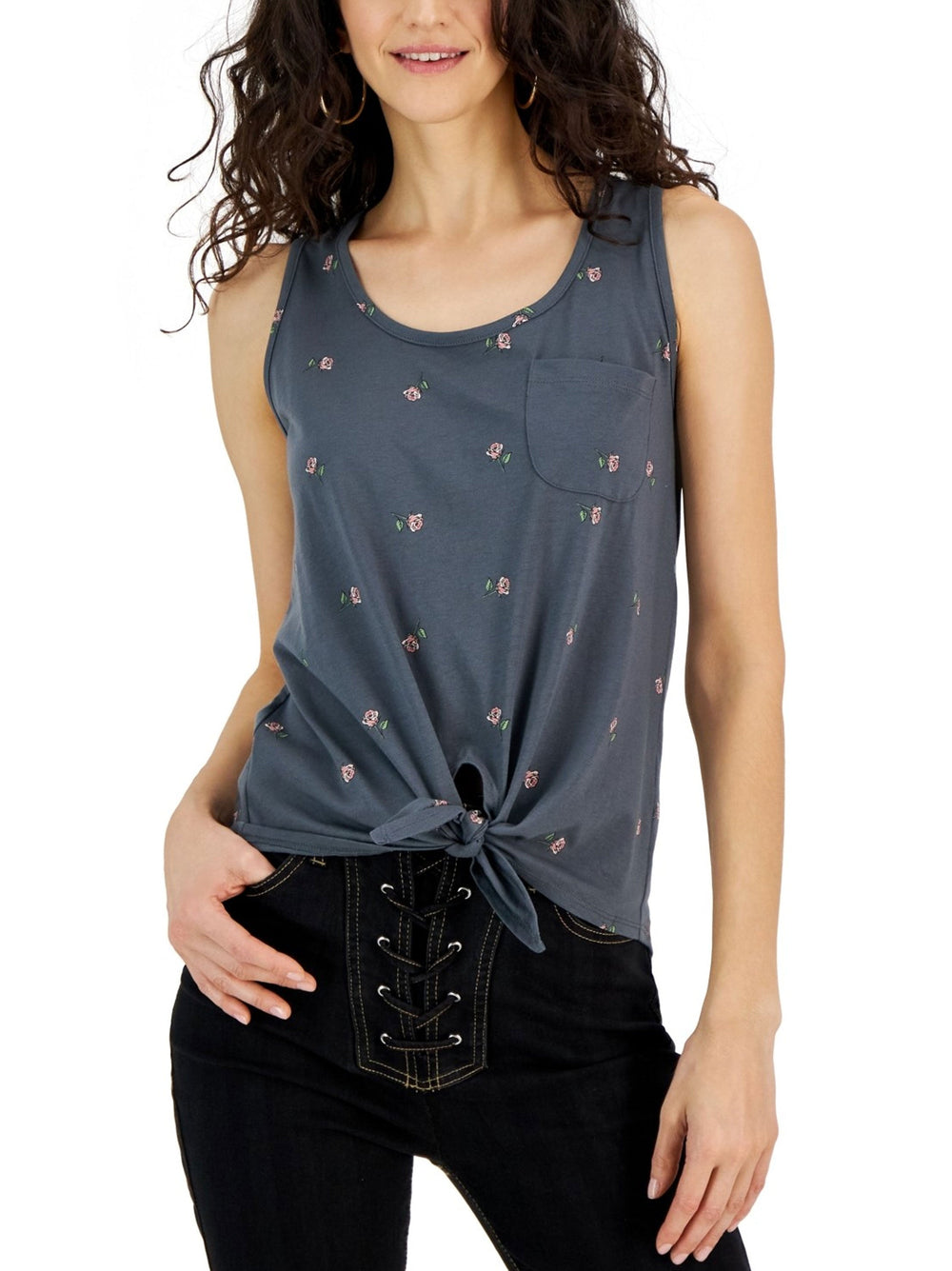 Women's Rose Printed Tie-Front Top,Dark Grey